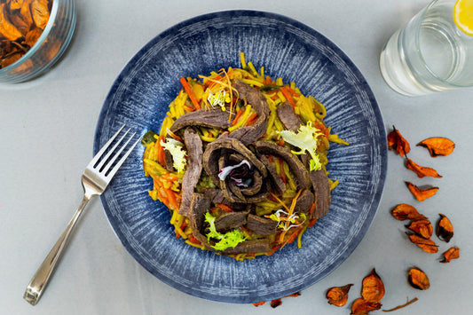 Juneći but sa sojinim umakom, spatzlama i svježim julienne mix povrćem.