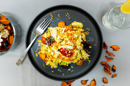 Sočni file pilećih prsa, kuskus, celer, mrkva i poriluk, uz dresing od maslinovog ulja, limuna i meda.