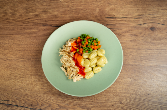 Sočna piletina u mango-paprika umaku s mekanim njokima, graškom i mrkvom.