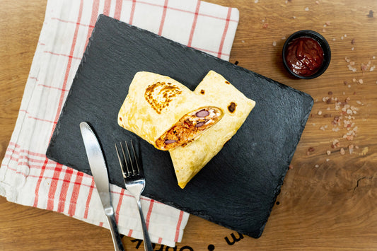 Ukusni wrap od piletine u kukuruznoj tortilji s lukom, paprikom, crvenim grahom, pasiranim rajčicama, sirom i jogurtom.